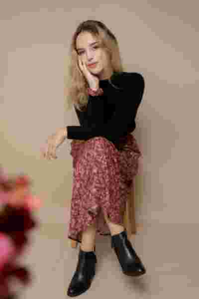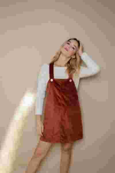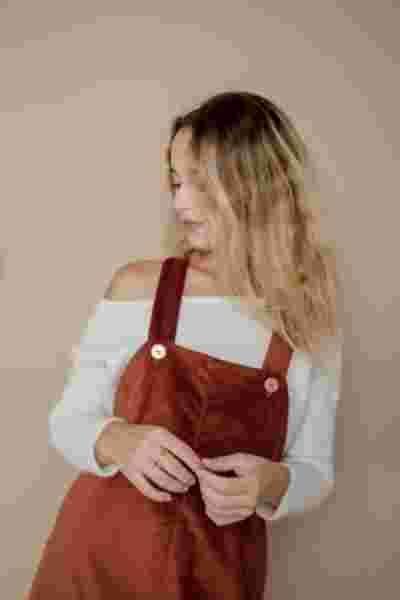 Shooting lookbook en studio pour April & C, marque française éco-responsable : robes velours, sweats, pantalons en lin et blouses. Une collaboration axée sur l'authenticité et la durabilité.